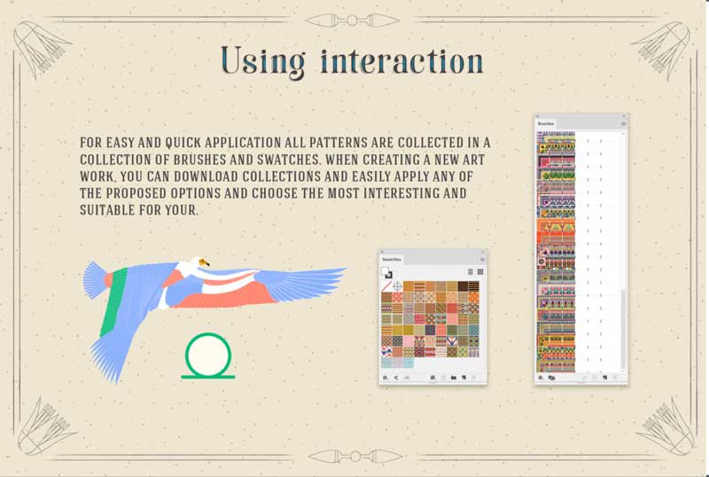 For easy and quick application all patterns are collected in a collection of brushes and swatches. When you create new artwork. You can download collections and easily apply any of the proposed options and choose the most interesting and suitable for yours