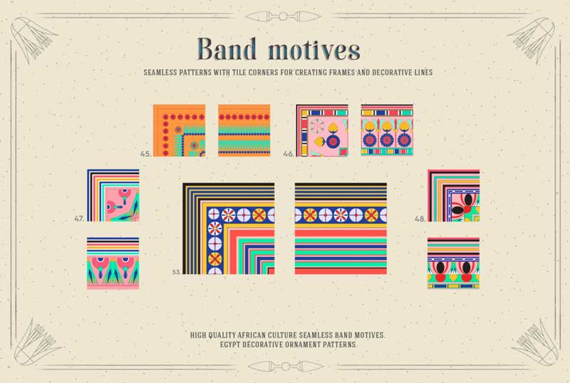 An extensive seamless pattern collection of band motives and filling patterns illustrations, restored from drawings of ancient Egypt decorative ornaments books. Out of all the ancient art forms, it’s perhaps the Egyptian art that captures the imagination the most. Each of the drawings is professionally drawn to maintain quality and convey the mood and meaning of the composition. Also checkout 150 Weather Photoshop Brushes.