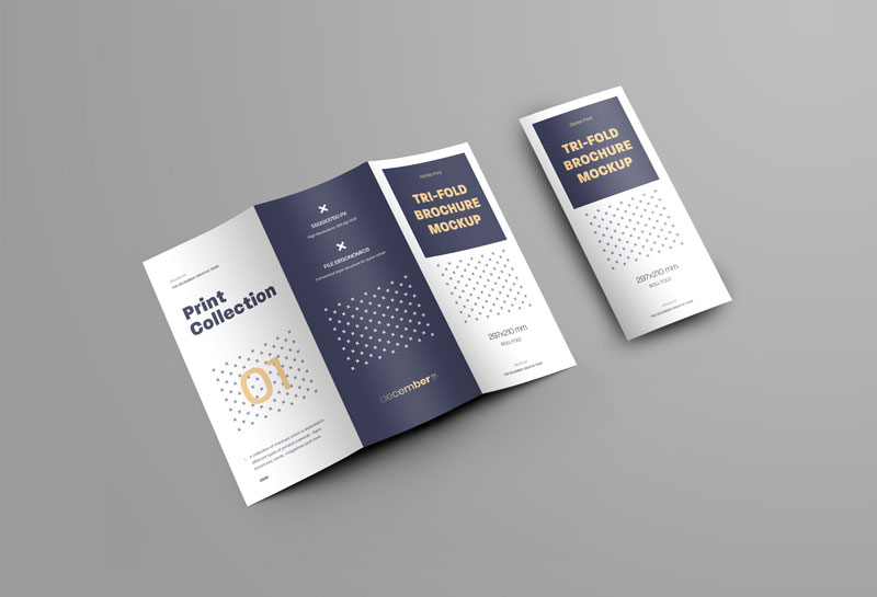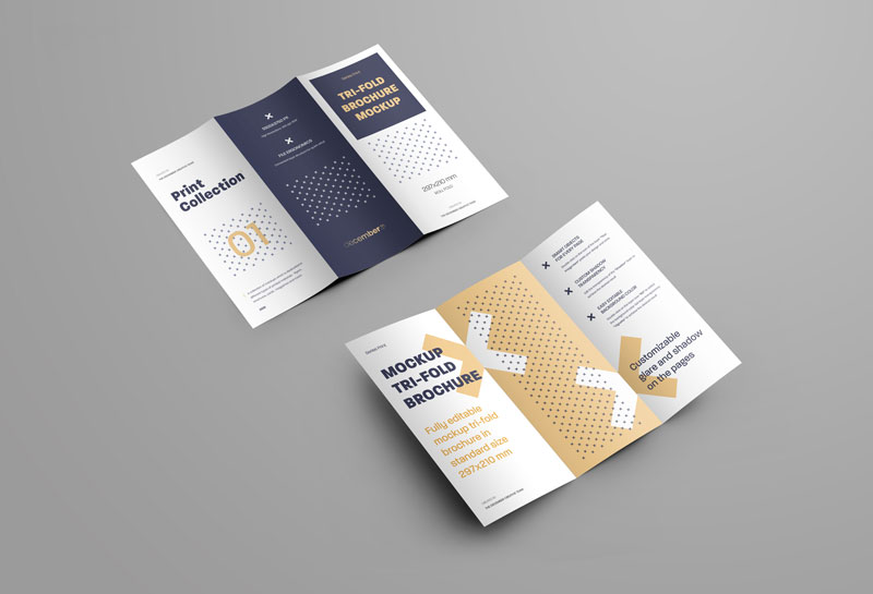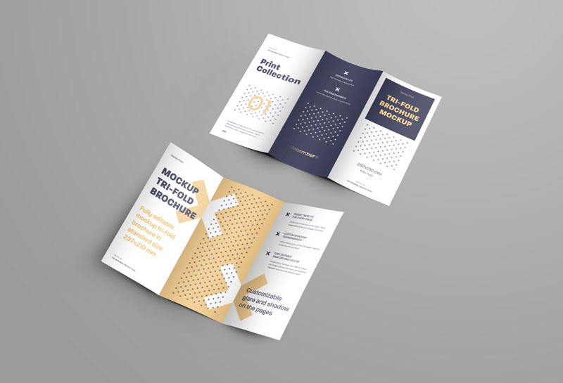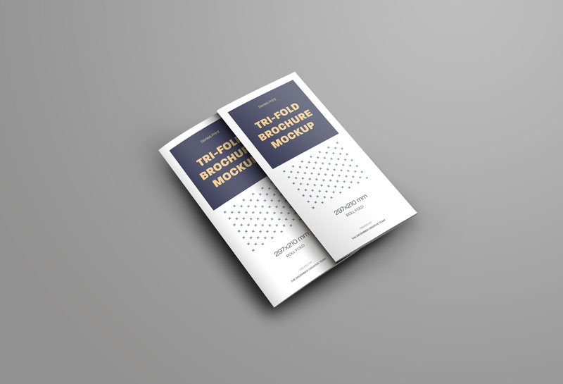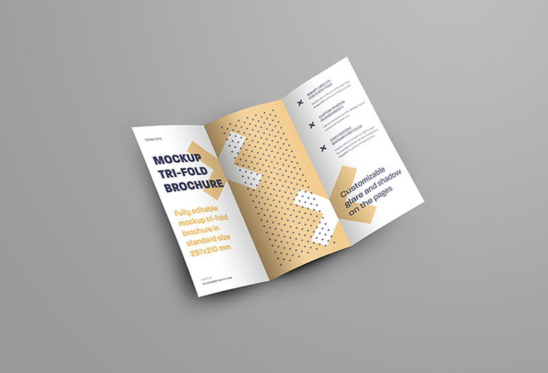 6 Mockups Leafleat DL Trifold Brochure for design presentation. Design is easy in customizing images design (on Trifold), color background, editable glass and shadow on pages. Smart objects for each page of the brochure.