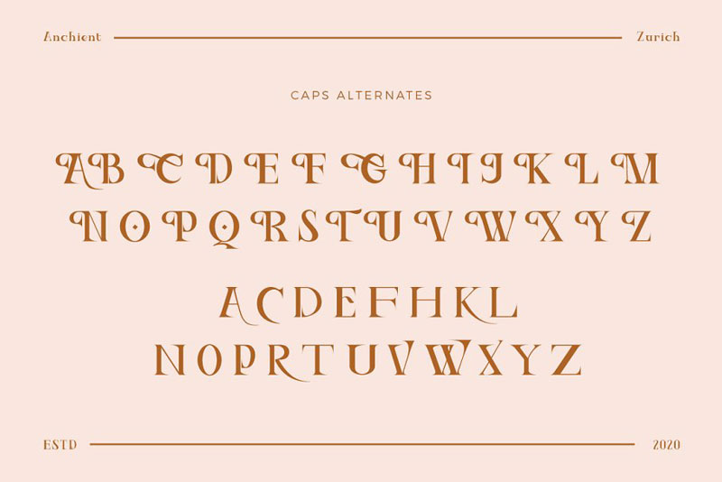 Ancient Zurich Serif was inspired by the trend of typography in SWISS. The font looks elegant and classy. and it works so well in modern settings as well as paired with Modern Sans. We love how easy it is to use in designs and know you will too.
