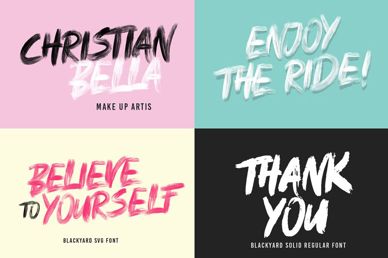 Blackyard is Original Handwritten letters. Using new Opentype-SVG font technology to provide super-high-resolution paint strokes completely built into the font as a transparency. This font can be used for vintage themes or themes with contemporary styles.