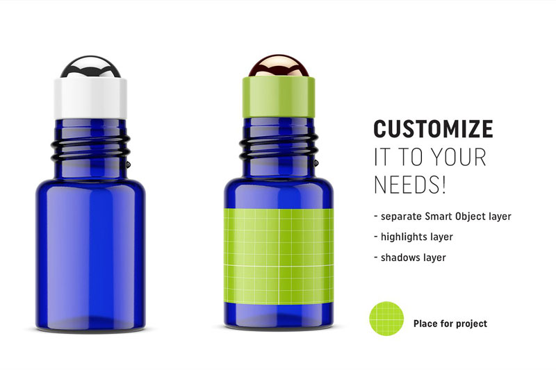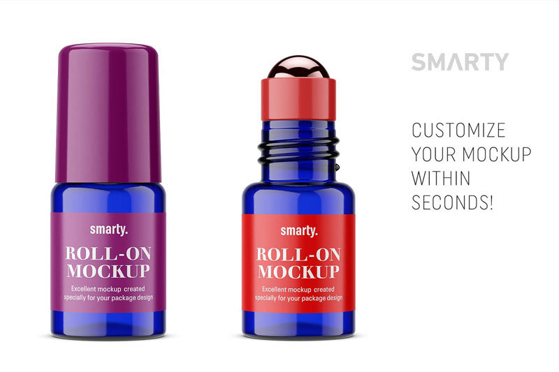 Blue roll-on bottle mockup. Used in the cosmetic industry. You can paste your project and change the ring and ball color. Cap can be turn off or on and also it’s color can be changed. It is easy to edit and modify.