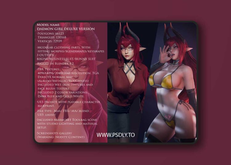 - This product is now a merged version of Daemon Girl and Daemon Girl Business Suit. Blender scene and UE5 project now have all of her previous outfits! (Bikini/Business Suit/Sensual wear/Bunny Suit)
