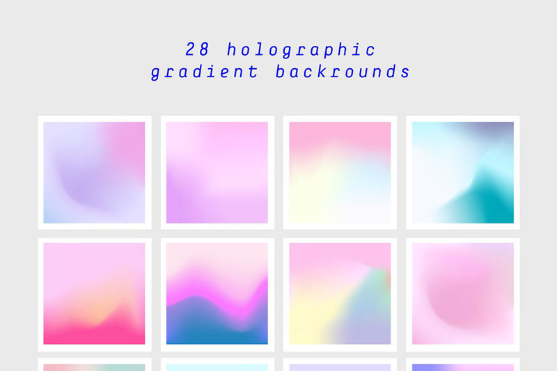 Introducing The Creativemarket Holographic Gradients. Here is a new design product Holographic Gradient pack 2020. You can use this set of 28 gradients to create modern and trendy designs. These gradients are created with complementary colors by using soft fades.