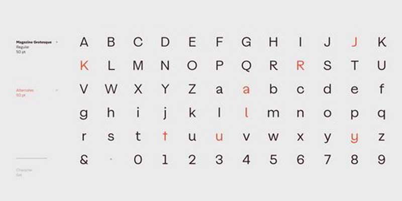 Magazine Grotesque is a sans-serif font specially designed for headlines and titles. Its unique features make it different from the traditional Grotesk typefaces. For example, outstroke extending beyond the body in a and e letters or closed aperture in c, creating an unusual rhythm.