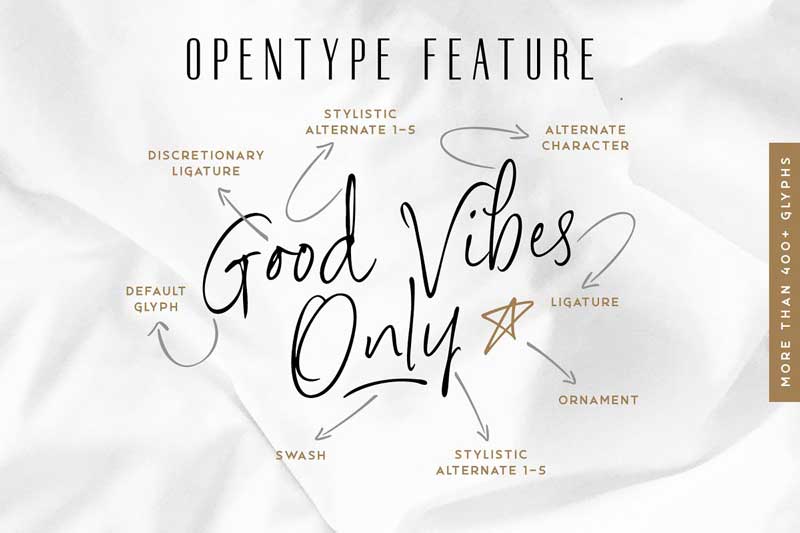 Misopen, Brobrq & Rockyeah Sans support multilingual & OpenType features, that can allow you to choose a character that you like and suitable for the project you’re working on.