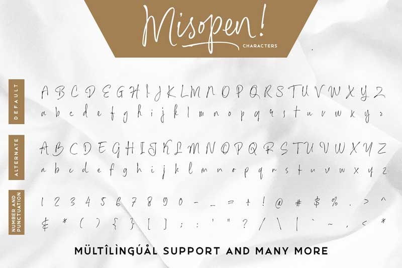 Misopen is a handwriting script font with a unique, casual and beautiful style. Misopen was made using a calligraphy pen with a fine nib. The process of making this font by writing a lot of sample letters and trying to make it connect naturally or using the OpenType feature called “ligature”.