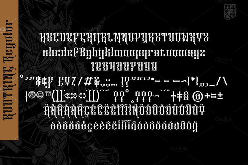 ROOTKING come from Gothic, Old English typography thin and thick strokes. the Textura Blackletter kinds, really strong, powerful. so they look best used for headings, logos, poster and sign. Blackletters have more recently become associated with beer label, Music, Book and many more