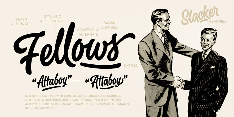 Slacker is equipped with Standard Ligatures and Contextual Alternates – they help to keep the flow lively and balanced and connections smooth so you should normally keep the features on. In addition, Slacker has Stylistic, Swash, and Titling Alternates for more showy letterforms.