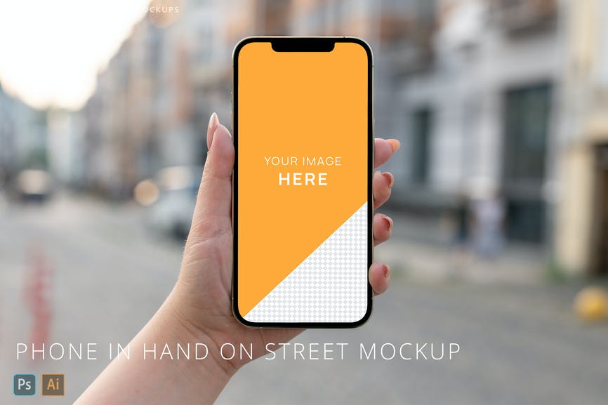 iPhone 12 Pro Max in Woman Hand on Street Mockup