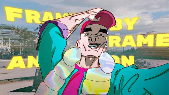 A character made in frame-by-frame animation (hip hop style in a holographic jacket) with a seamless transition through the gap of the cap