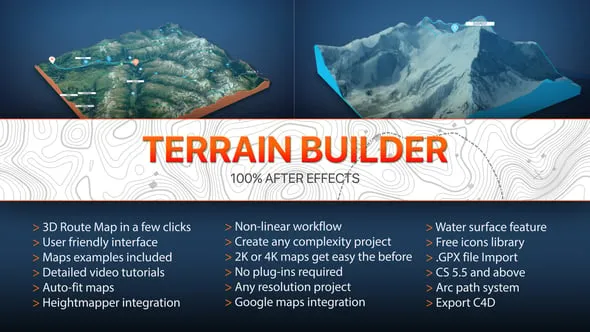 The Terrain Builder After Effects template is perfect to create paths and trajectories of any complexity on 3D Terrain. It is completely customizable and easy to use. The project is made in After Effects CS5.5+ and no third party plugins needed. You need only 2 images (Height map and Color map) to create 3D terrain and project automatically generate 3d Terrain. The project contains the base icon set which you can use absolutely free. You can use your own icons too. You have complete control on all main properties using multiple helper layers. The project contains modular structure and everything can be changed in nonlinear workflow. Easy to add any elements on map (footage, photo, video, composition). You can build a very complex 3D scene easier and faster than before.